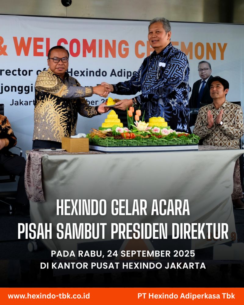 PT Hexindo Adiperkasa Tbk held a farewell and welcoming ceremony on Wednesday, September 24, 2025, at its head office in Jakarta, marking the leadership transition from Mr. Djonggi TP Gultom to Mr. Dwi Swasono as President Director.
