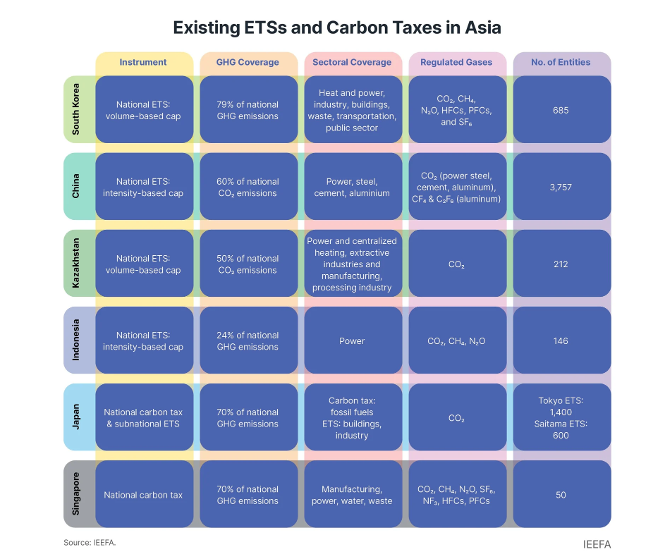 IEEFA found that despite increasing adoption of national emissions trading systems (ETSs) and carbon taxes in countries such as China, South Korea, Indonesia, and Japan, the effectiveness of these policies is being undermined by weak price signals, excessive free allocation of permits, and limited sectoral coverage.